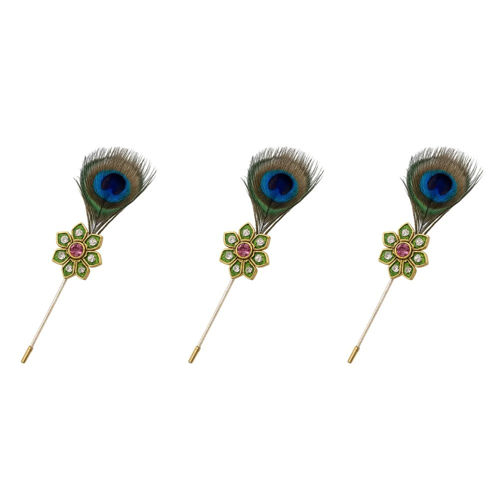 Enhance your traditional and festive outfits with this Krishna Peacock Feather Brooch Pin Combo (Pack of 3), designed to bring royal elegance to your attire. Each brooch features a beautiful gold-plated floral design embellished with sparkling crystal stones and a vibrant center gem, paired with a natural-style peacock feather inspired by the iconic symbol associated with Lord Krishna. These stylish stick lapel pins are perfect for sherwanis, bandhgalas, suits, blazers, and ethnic jackets, making them ideal for weddings, cultural events, festive celebrations, and special occasions. The slim stick-pin design ensures secure attachment while maintaining a sophisticated look.
