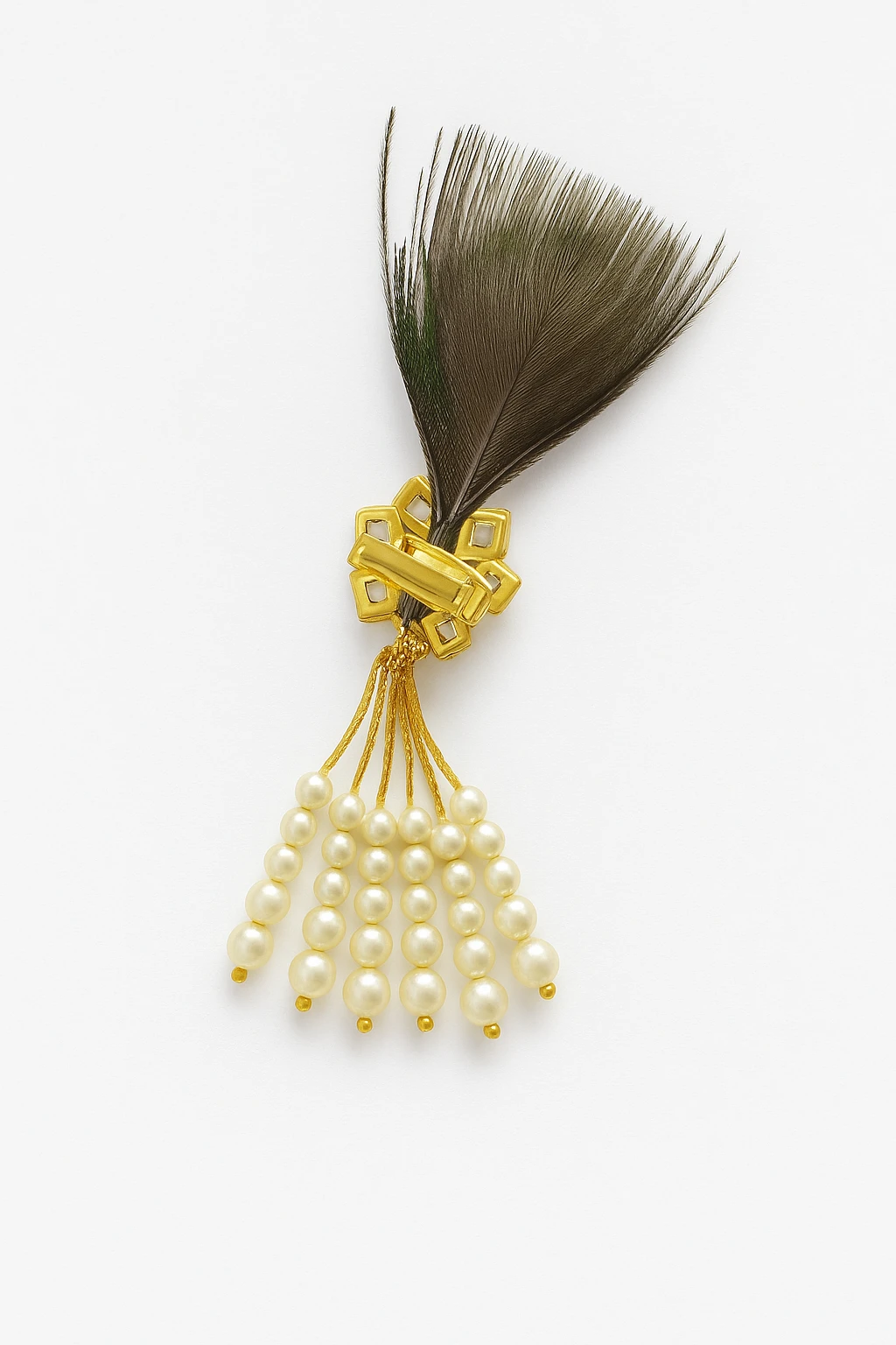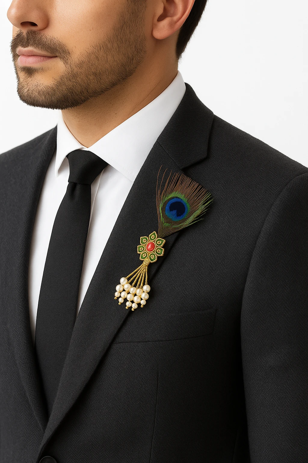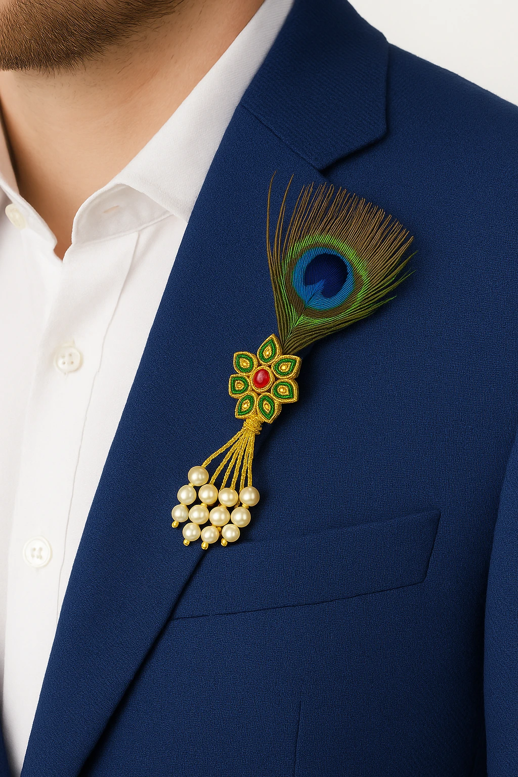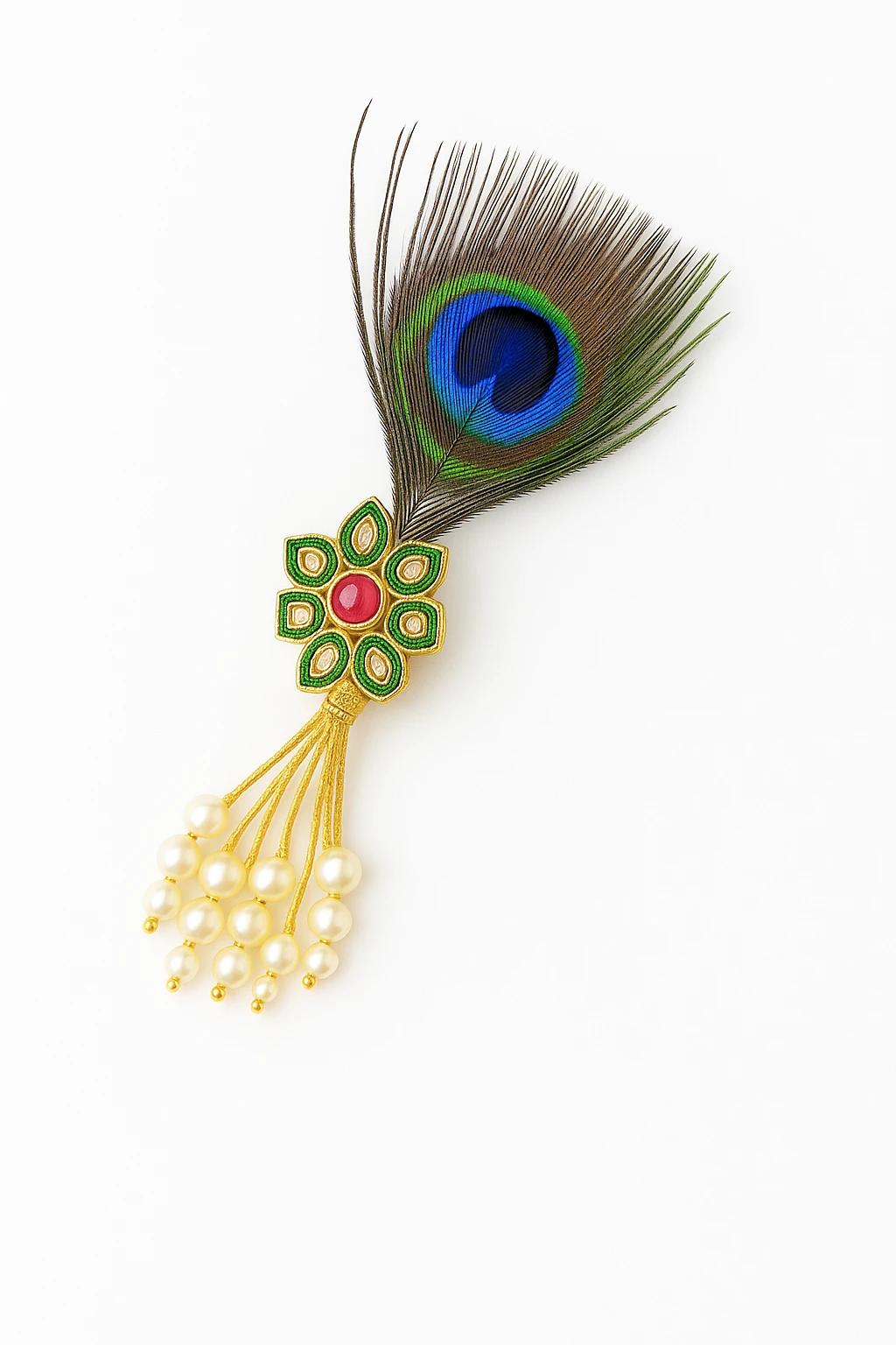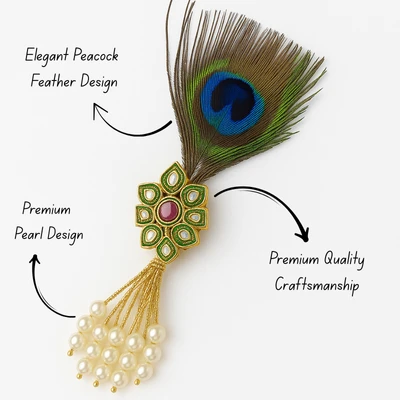 Add royal charm to your traditional attire with this Krishna Peacock Feather Pearl Tassel Brooch, a beautifully designed accessory inspired by classic Indian heritage. The brooch features a gold-plated floral motif with green enamel detailing and a vibrant red center stone, elegantly paired with a natural-style peacock feather symbolizing grace and spirituality. The highlight of this piece is its delicate pearl tassel dangle, which adds movement and a luxurious touch to the design. Perfect for sherwanis, bandhgalas, blazers, suits, and ethnic jackets, this brooch enhances your look for weddings, festive celebrations, cultural events, and special occasions.