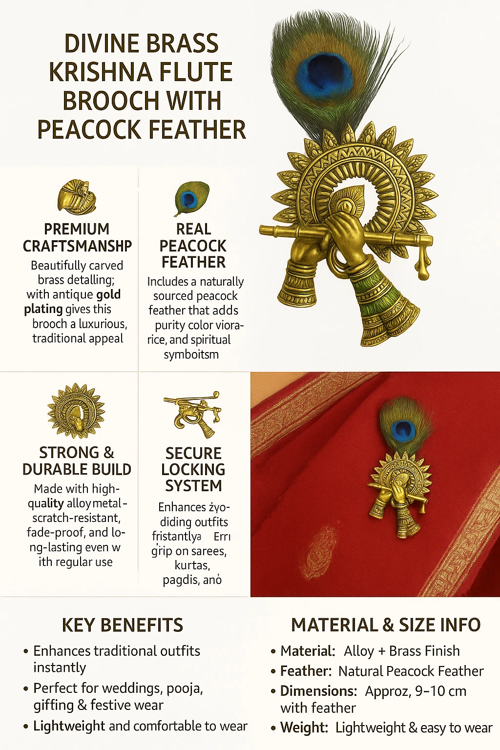 Bring divine charm and spiritual elegance to your home with this beautifully designed Lord Krishna Flute with Peacock Feather Wall Decor. Inspired by the iconic image of Krishna playing the Bansuri, this decorative piece features intricately crafted golden hands holding a flute, adorned with a vibrant peacock feather, symbolizing beauty, grace, and devotion. Perfect for home temples, pooja rooms, living rooms, meditation spaces, or spiritual corners, this wall decor adds a sacred and artistic touch to any interior. The detailed craftsmanship and antique golden finish give it a traditional yet premium look, making it an ideal gift for housewarming, festivals, Janmashtami, Diwali, or religious occasions.
