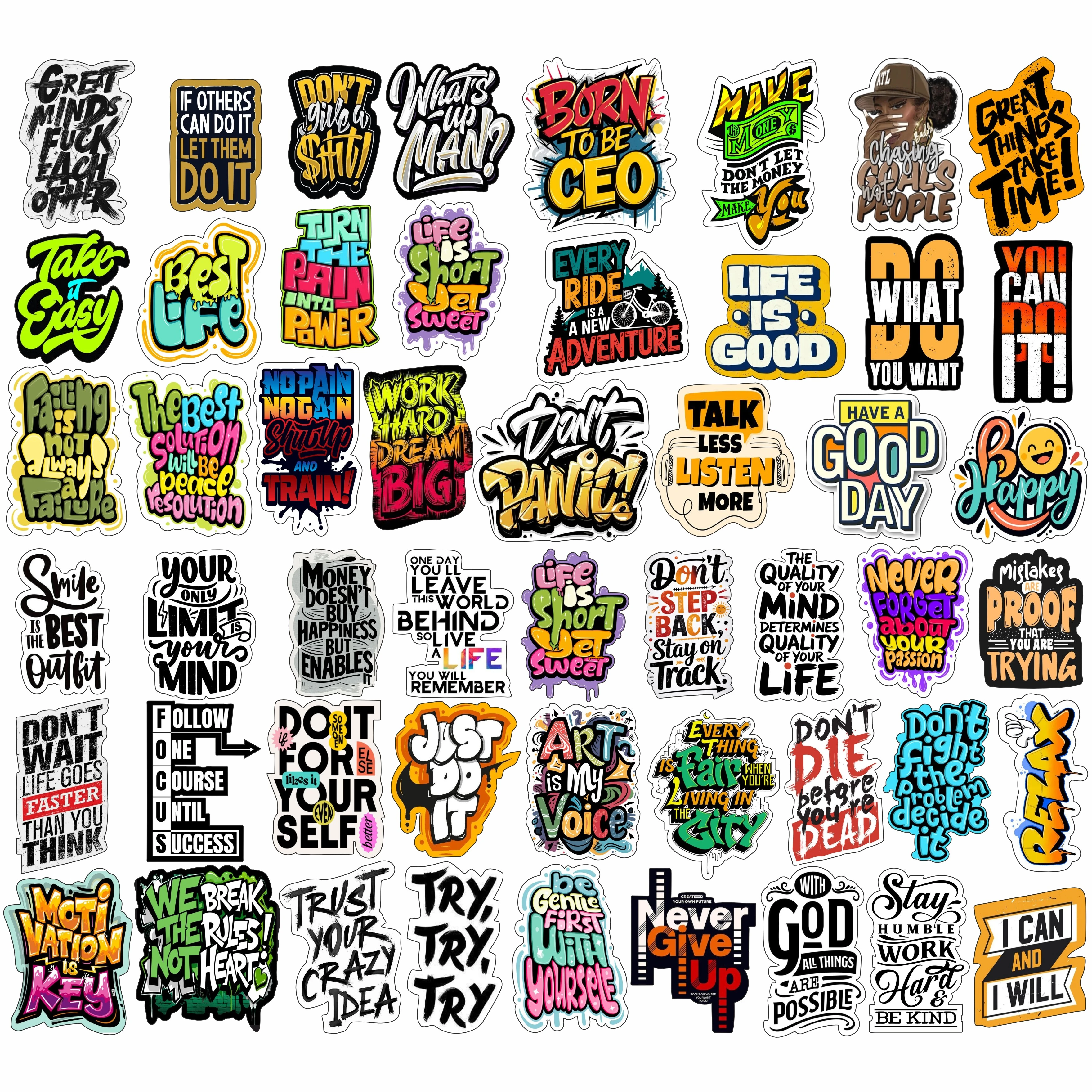 Transform your personal space and gear into a source of daily inspiration. This curated collection of 50 unique stickers is designed to fuel your hustle, brighten your mood, and add a professional yet personal touch to everything you own. Key Features