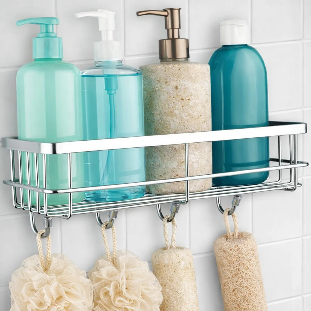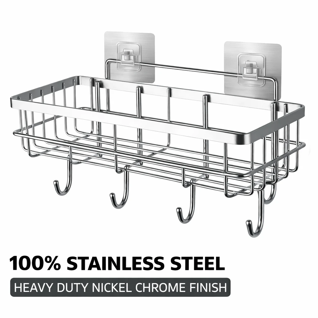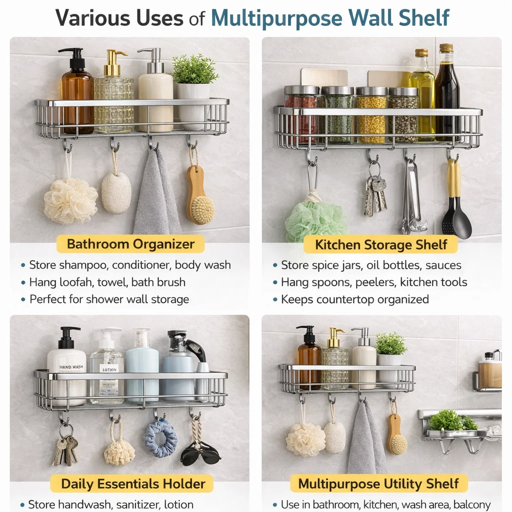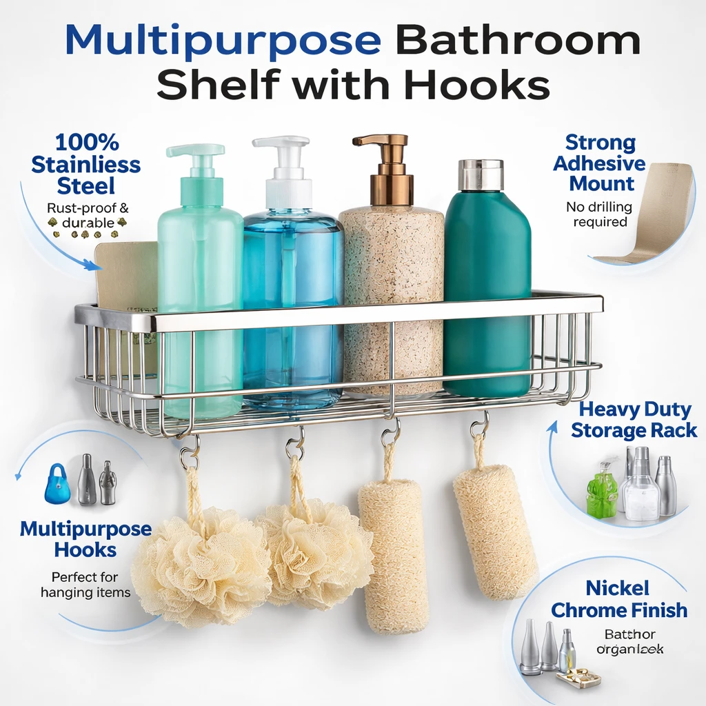 Upgrade your bathroom organization with this Multipurpose Stainless Steel Bathroom Shelf with Hooks, designed to keep your essentials neatly arranged and easily accessible. Made from high-quality rustproof stainless steel, this wall-mounted shower caddy offers durability, strength, and long-lasting performance even in humid bathroom environments. The adhesive wall-mounted design allows easy installation without drilling, protecting your tiles and walls while providing strong support for daily bathroom essentials. The spacious shelf can conveniently hold shampoo bottles, conditioner, soap, face wash, body wash, and other accessories, while the integrated hooks allow you to hang items such as loofahs, razors, towels, or brushes. Its modern and minimal design blends seamlessly with any bathroom decor while maximizing storage space. Perfect for bathrooms, kitchens, wash areas, or utility spaces, this organizer helps maintain a clean and clutter-free environment. Key Features
