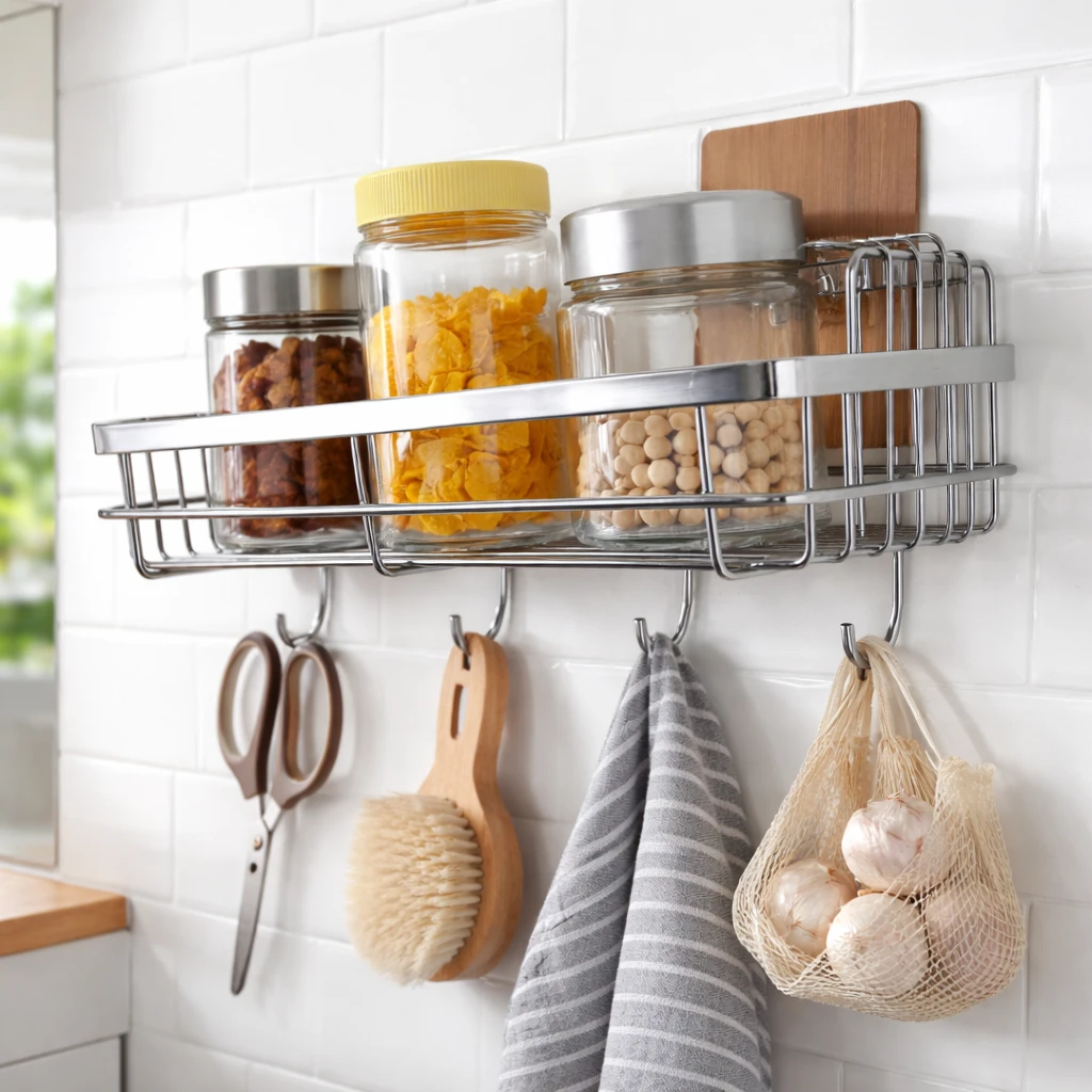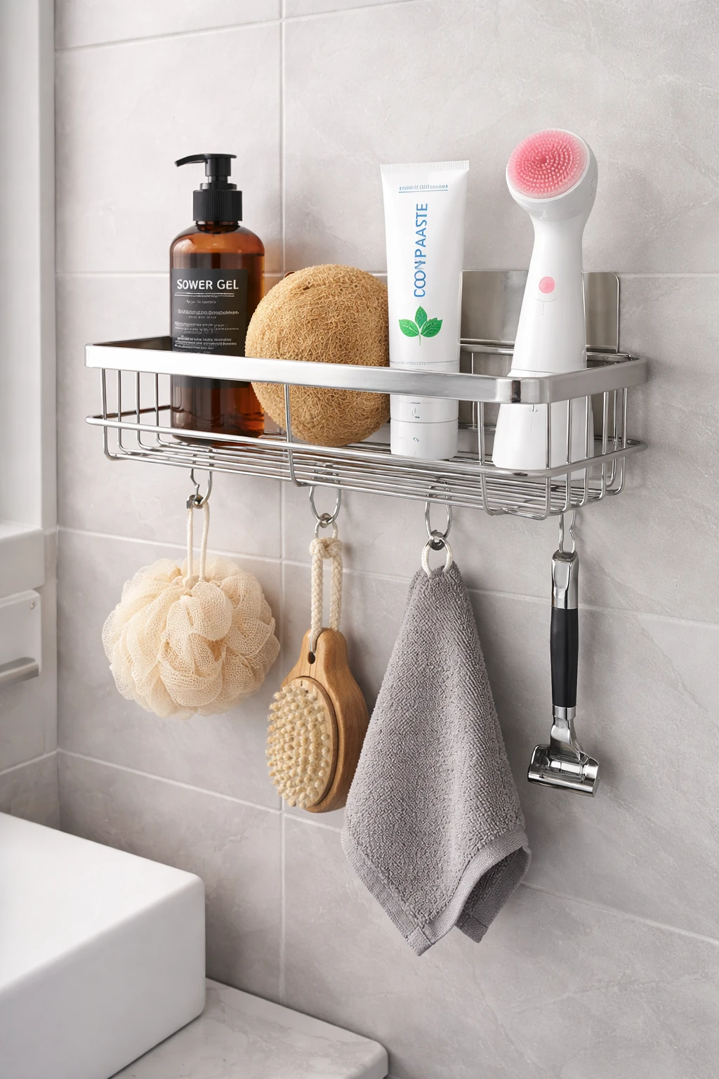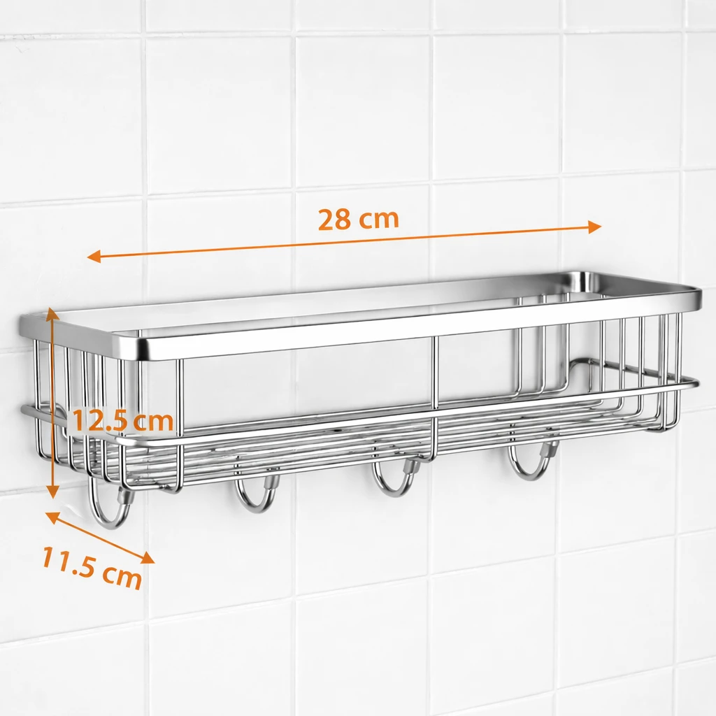 Upgrade your bathroom organization with this Multipurpose Stainless Steel Bathroom Shelf with Hooks, designed to keep your essentials neatly arranged and easily accessible. Made from high-quality rustproof stainless steel, this wall-mounted shower caddy offers durability, strength, and long-lasting performance even in humid bathroom environments. The adhesive wall-mounted design allows easy installation without drilling, protecting your tiles and walls while providing strong support for daily bathroom essentials. The spacious shelf can conveniently hold shampoo bottles, conditioner, soap, face wash, body wash, and other accessories, while the integrated hooks allow you to hang items such as loofahs, razors, towels, or brushes. Its modern and minimal design blends seamlessly with any bathroom decor while maximizing storage space. Perfect for bathrooms, kitchens, wash areas, or utility spaces, this organizer helps maintain a clean and clutter-free environment. Key Features