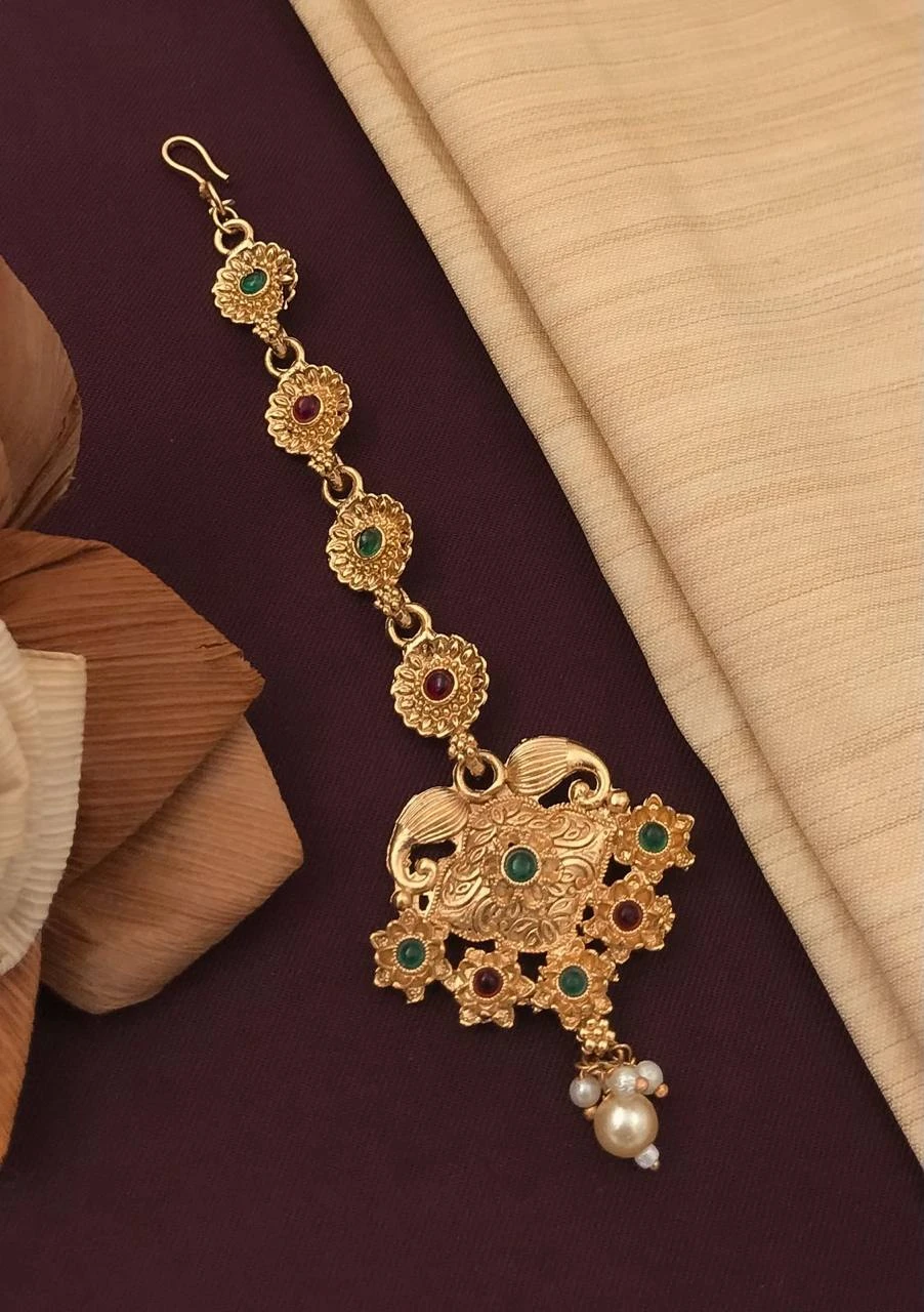 This beautifully crafted maang tikka features intricate detailing and a radiant finish, giving you a royal and timeless look that complements any ethnic outfit. |