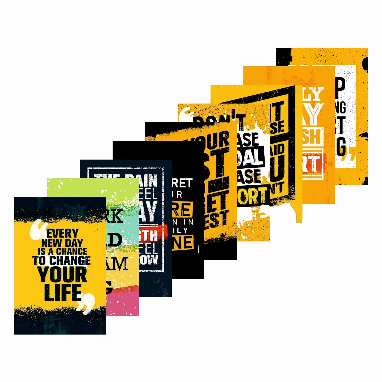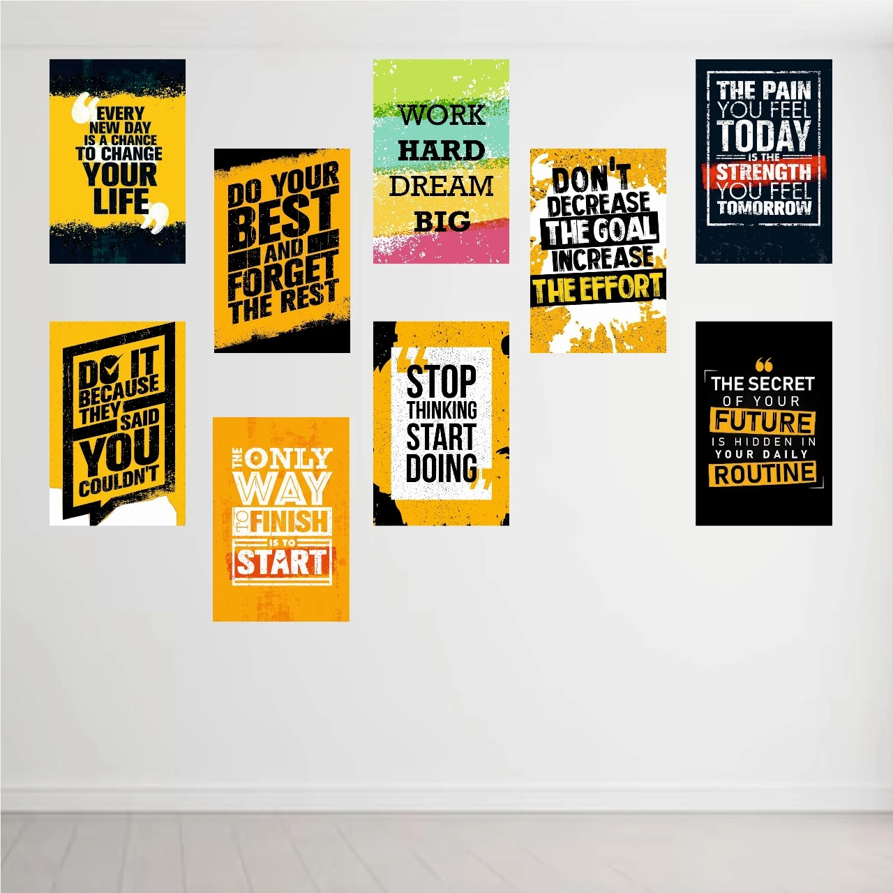 Design & AestheticThe collection features a cohesive Urban Grunge style. Using a high-contrast color palette of Industrial Yellow, Bold Black, and Crisp White, these posters are designed to be legible from a distance while adding a textured, artistic edge to your decor. Included Motivational Quotes: