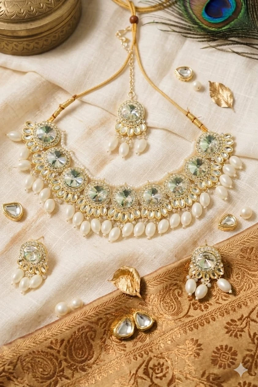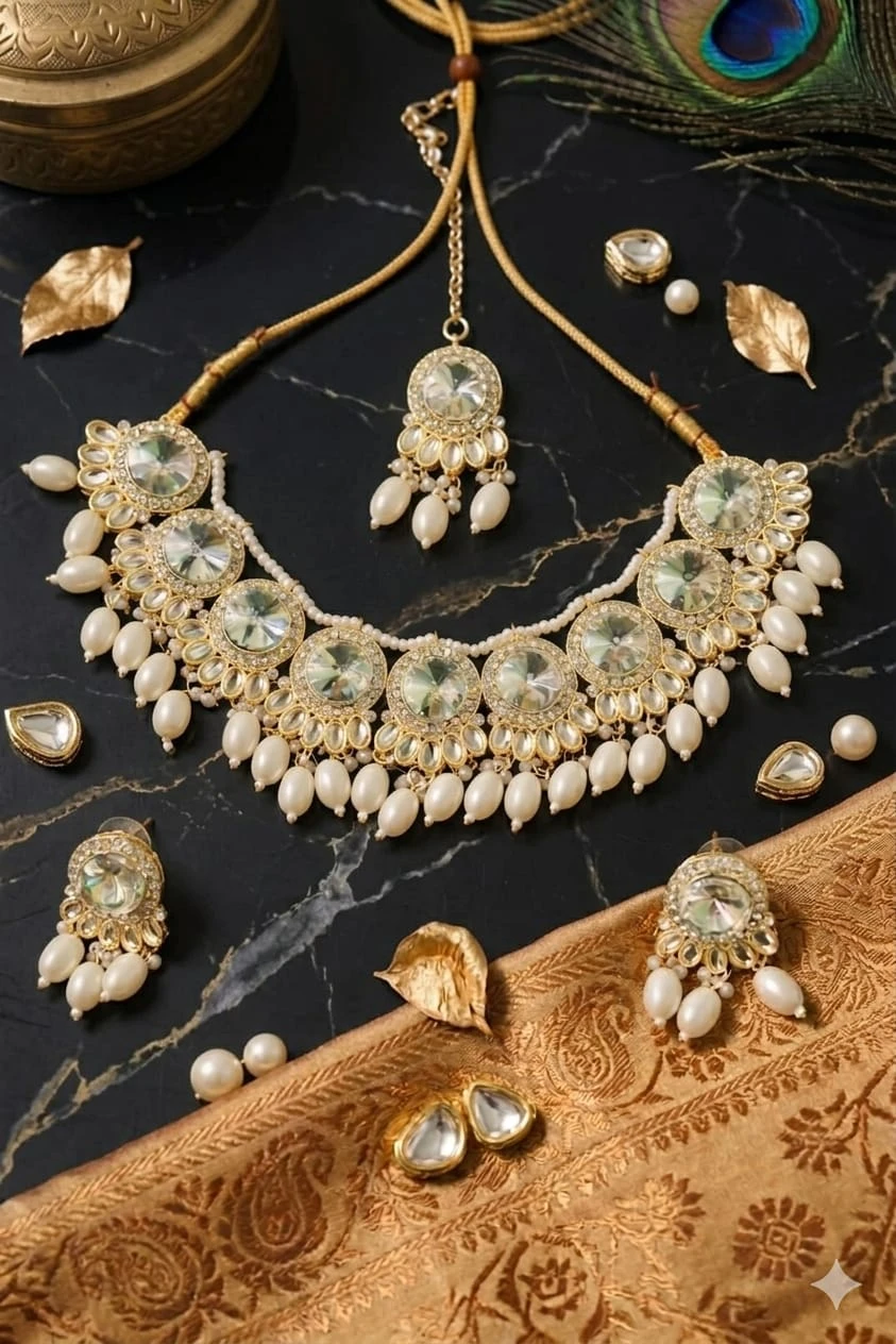 Elegant aur royal look dene wala yeh pearl aur kundan choker set kisi bhi wedding, function ya festive occasion ke liye perfect hai. Isme high-quality artificial pearls aur shining kundan stones use kiye gaye hain jo aapko classy aur premium look dete hain. Adjustable thread ke saath aata hai, isliye comfortable fitting milti hai. Set mein matching earrings aur maang tikka included hain, jo complete traditional look deta hai. |