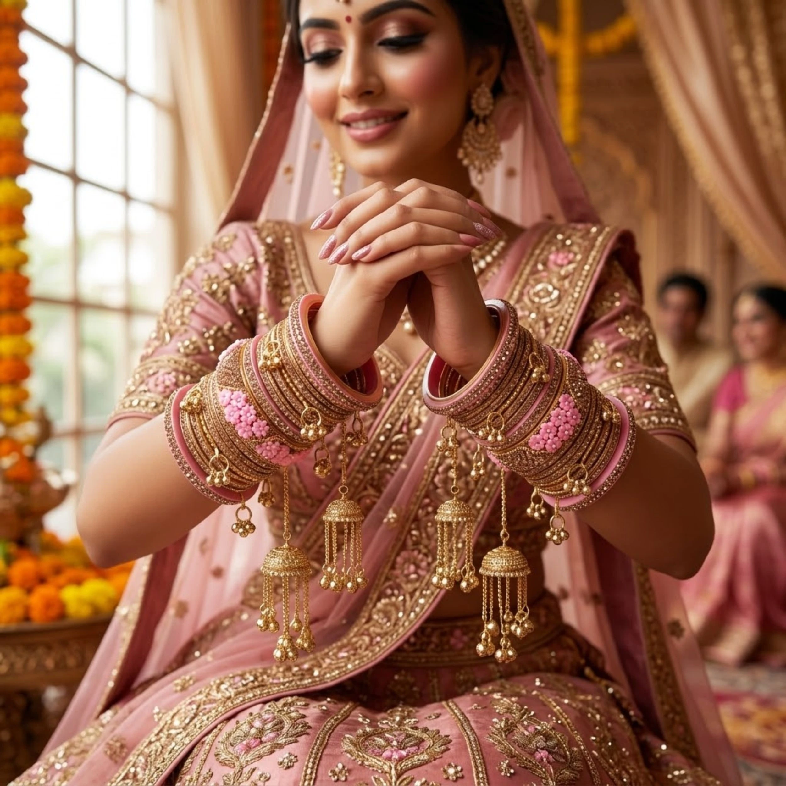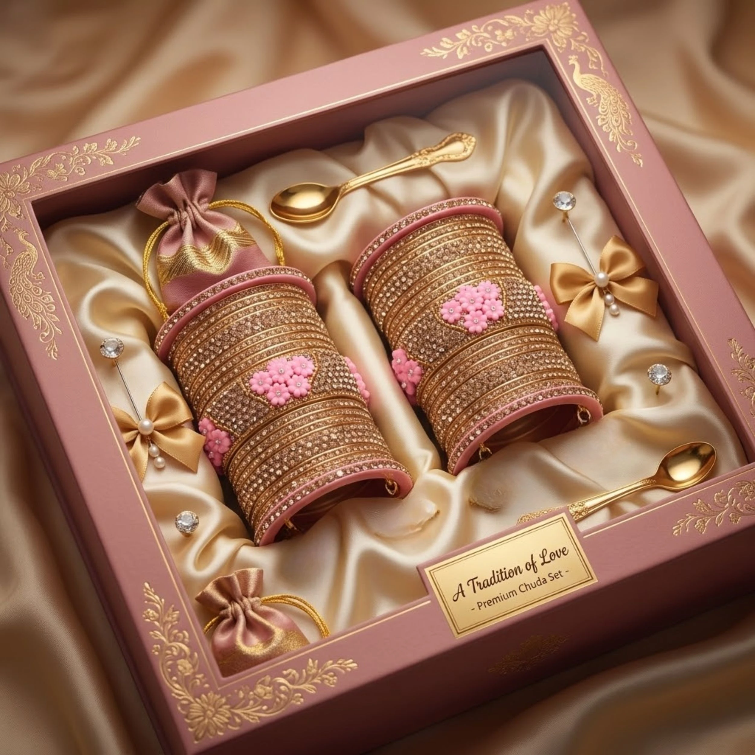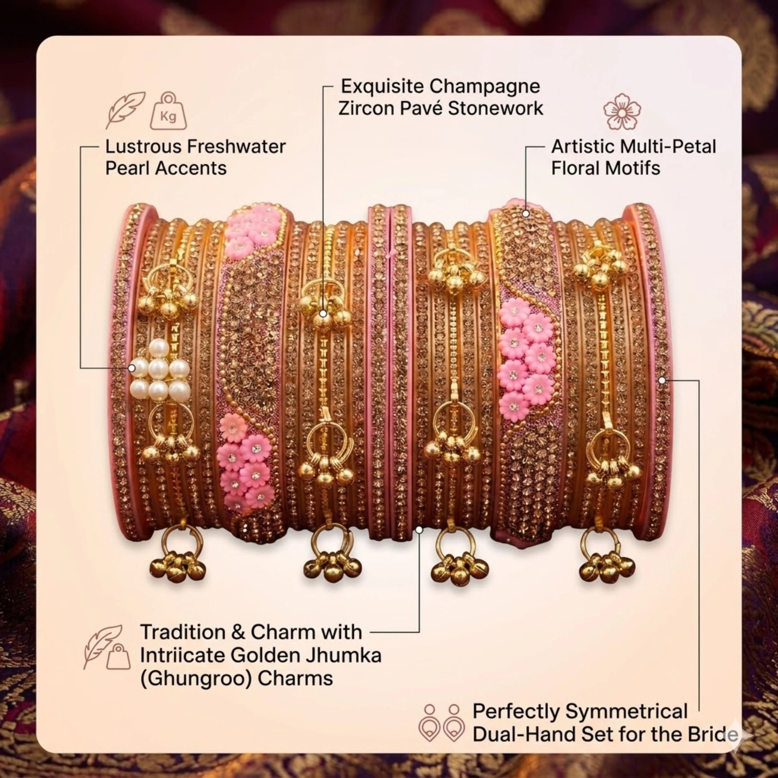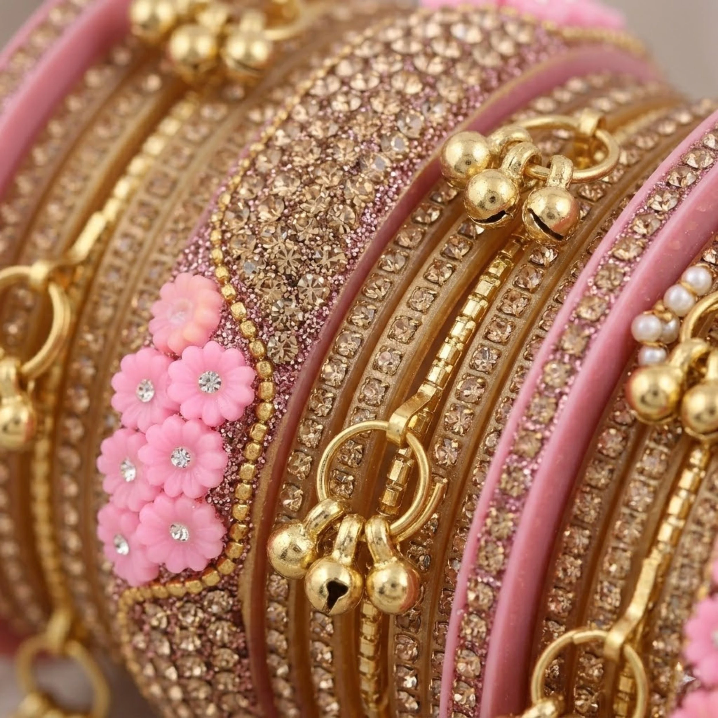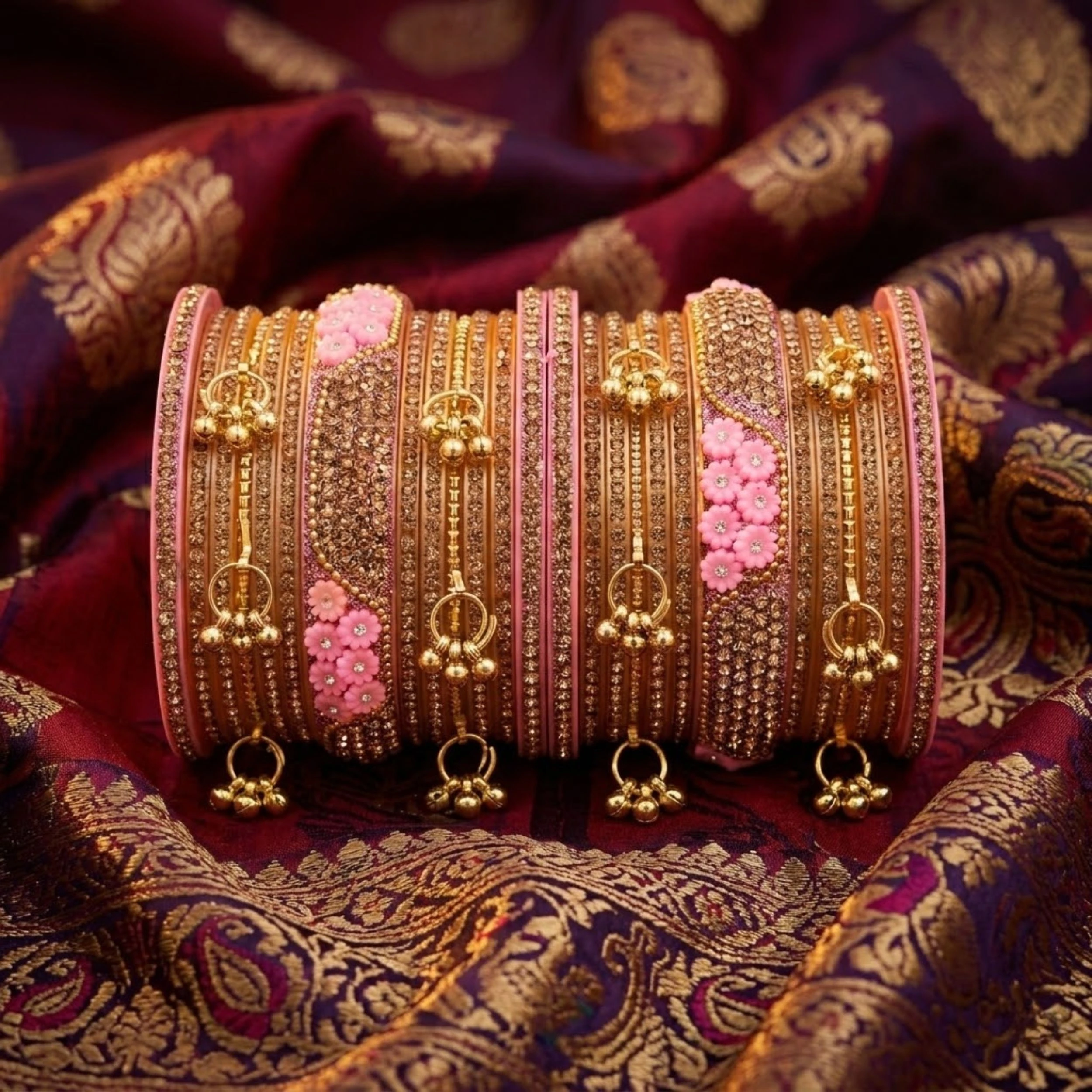 Enhance your bridal look with this elegant pink and gold chuda set, beautifully crafted with sparkling stone work and delicate floral design. The set features premium finishing with hanging ghungroo charms that add a traditional and graceful touch. Perfect for weddings, engagements, and festive occasions, this chuda set offers a rich and royal appearance. |