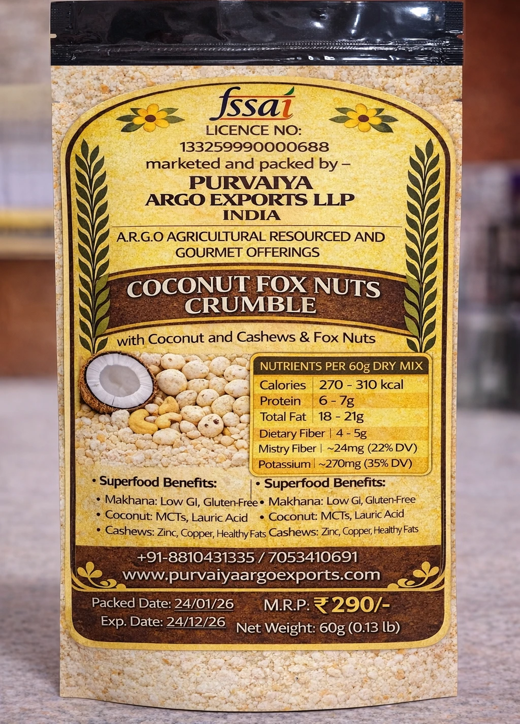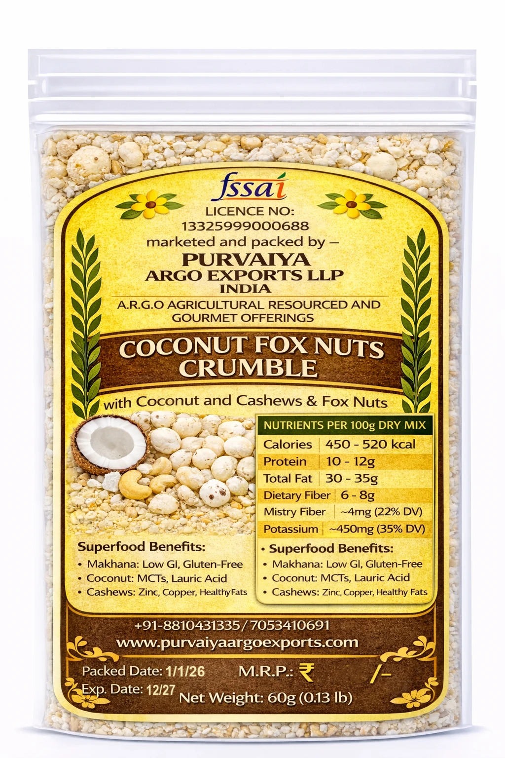 Purvaiya ARGO Nariyal Makhana Raisins Cashews Kheer Mix is a wholesome, sugar-free blend made from Bihar’s premium makhana, pure coconut (nariyal), raisins, and cashews, offering a naturally rich and creamy kheer. Health Benefits High in plant protein & minerals for strength and energy Supports bone health & digestion Boosts immunity & stamina Light, nourishing and easy to digest No added sugar – suitable for all age groups Cultural Heritage of Bihar In Bihar, makhana kheer holds a sacred place in tradition. It is offered as Mahabhogam to deities in temples and home pujas, symbolizing purity, prosperity, and devotion. It is an essential part of weddings, Chhath Puja, festivals, and family celebrations, where it is served to guests as a blessing of good health and happiness. Purvaiya ARGO brings this royal and spiritual Bihari tradition into a modern, healthy kheer mix for today’s lifestyle. |