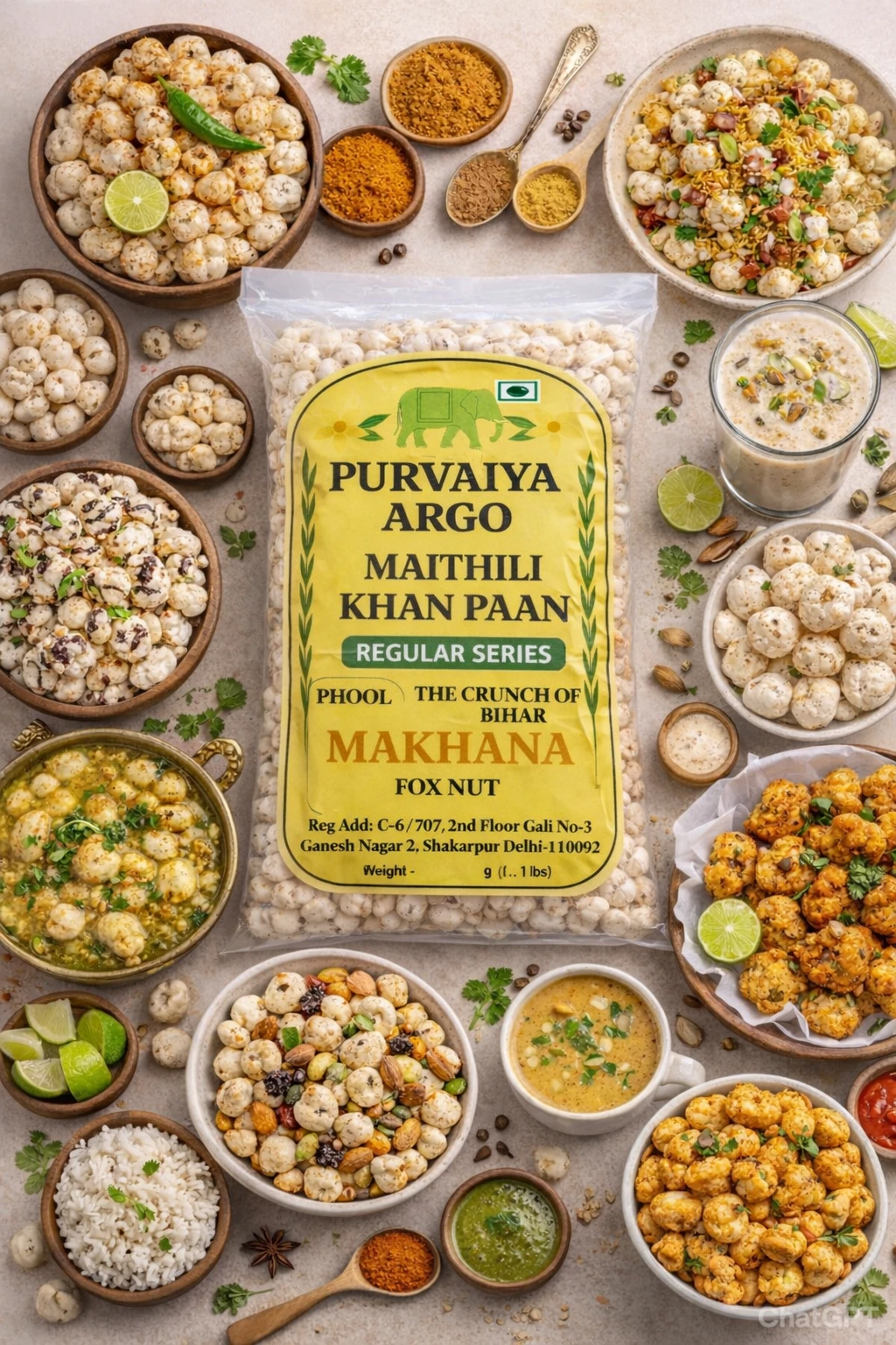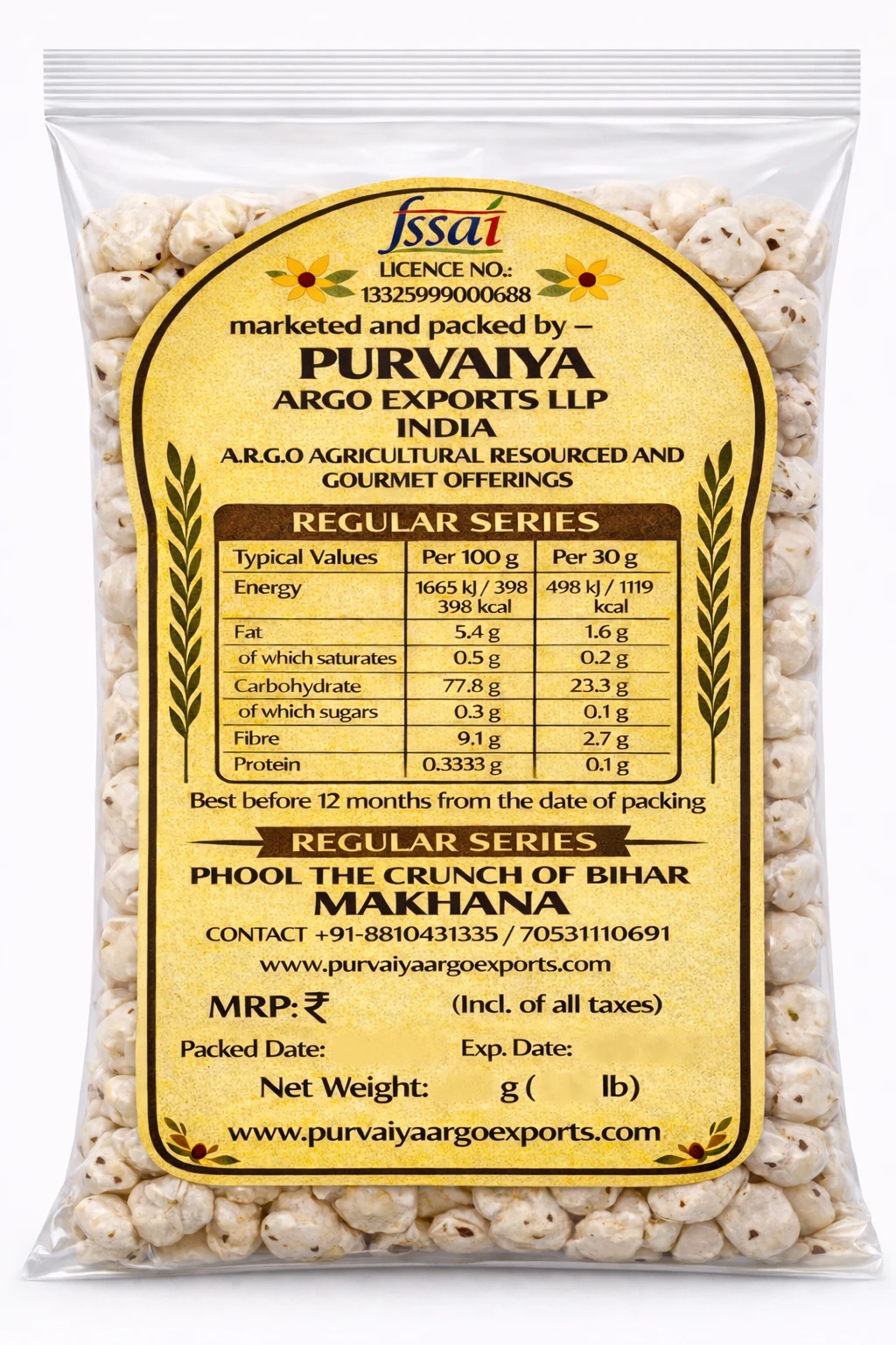 Purvaiya Argo Regular Foxnuts (Makhana) Our Regular Foxnuts are carefully sourced from the finest farms and processed with precision to ensure consistent quality, purity, and taste. These premium-grade makhana are naturally grown, hygienically processed, and packed to retain their freshness and crunch. With their light texture and subtle flavor, Purvaiya Argo Regular Foxnuts are perfect for roasting, seasoning, or using in a variety of traditional and modern recipes. Rich in protein, low in fat, and gluten-free, they make for a healthy and nutritious snack suitable for all age groups. Key Features:
