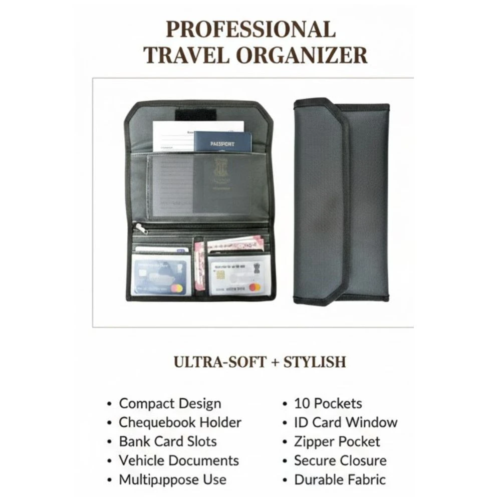 Keep your important documents safe, organized, and easy to access with this Multipurpose Document Holder Wallet. Designed with a compact and slim structure, this organizer is perfect for storing your cheque book, passbook, cards, vehicle documents, and other essential papers in one convenient place. Made with durable fabric material and strong stitching, this document holder ensures long-lasting use and reliable protection for your valuable items. Its lightweight and portable design allows you to easily carry it in your bag, car, or while traveling. The wallet features multiple storage pockets, card slots, and a secure zipper compartment, helping you keep your documents neatly arranged and protected. Whether for daily use, office needs, or travel purposes, this multipurpose organizer is a practical and stylish solution for managing your documents.