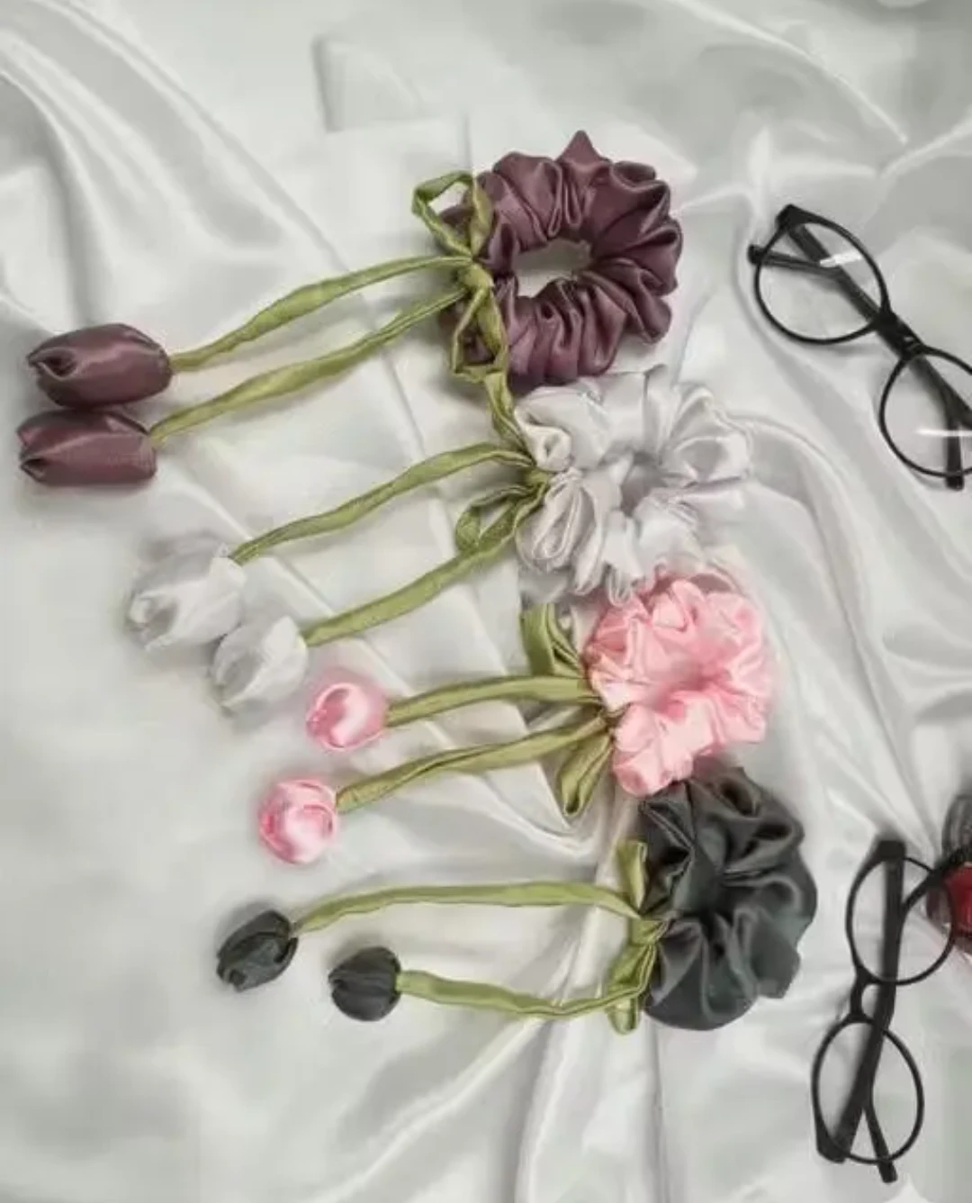 Beautiful multicolour satin fabric scrunchies with tulip flower for women and girls ( 2 pcs) |