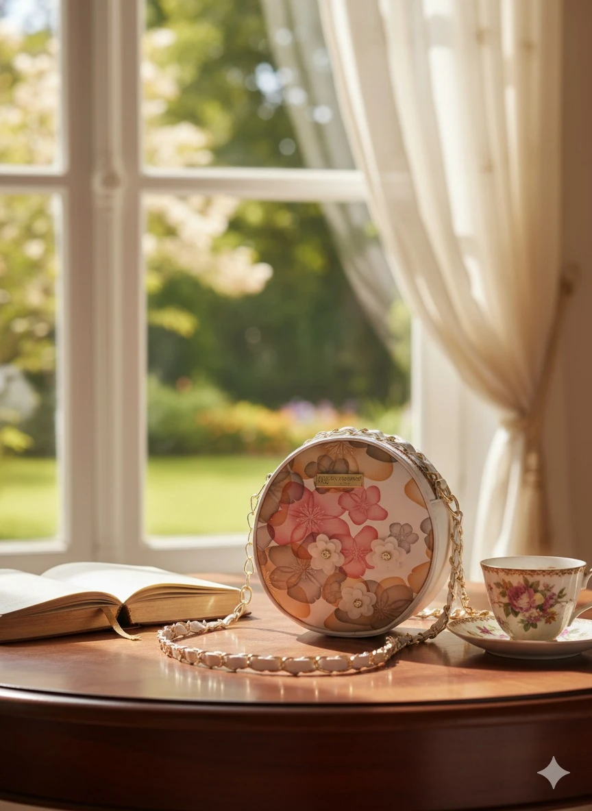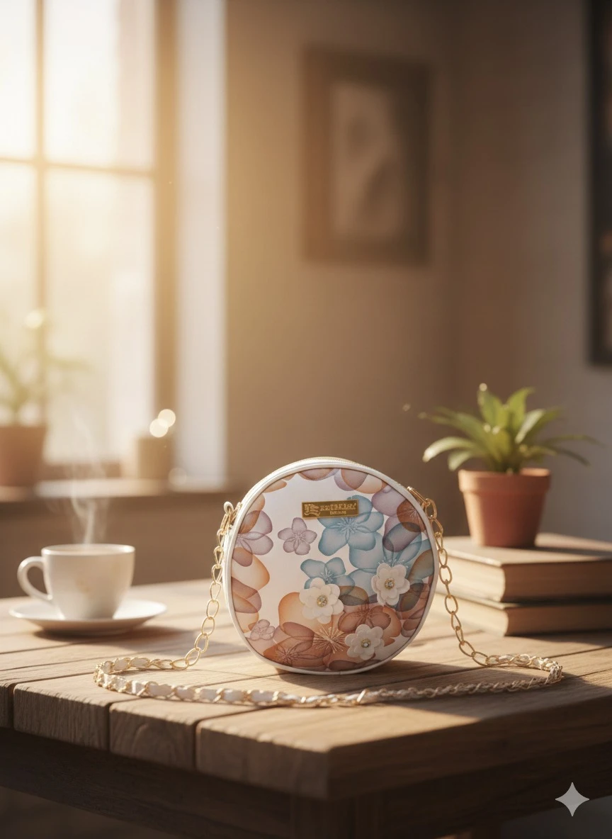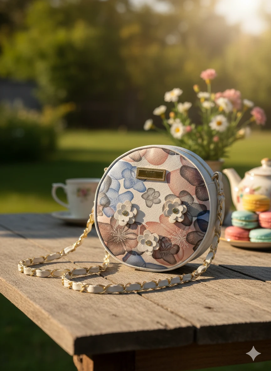 Height=7inch, Length=7inch, Width=3inch. Add a touch of elegance to your outfit with this stylish Round Floral Sling Bag. Designed with a beautiful pastel floral print and delicate 3D flower embellishments, this purse is perfect for casual outings, parties, brunch dates, and festive occasions. The compact round shape gives it a trendy look, while the premium-quality material ensures durability. It features a smooth zip closure to keep your essentials secure. The golden chain strap adds a classy finish and allows comfortable crossbody or shoulder carrying. |