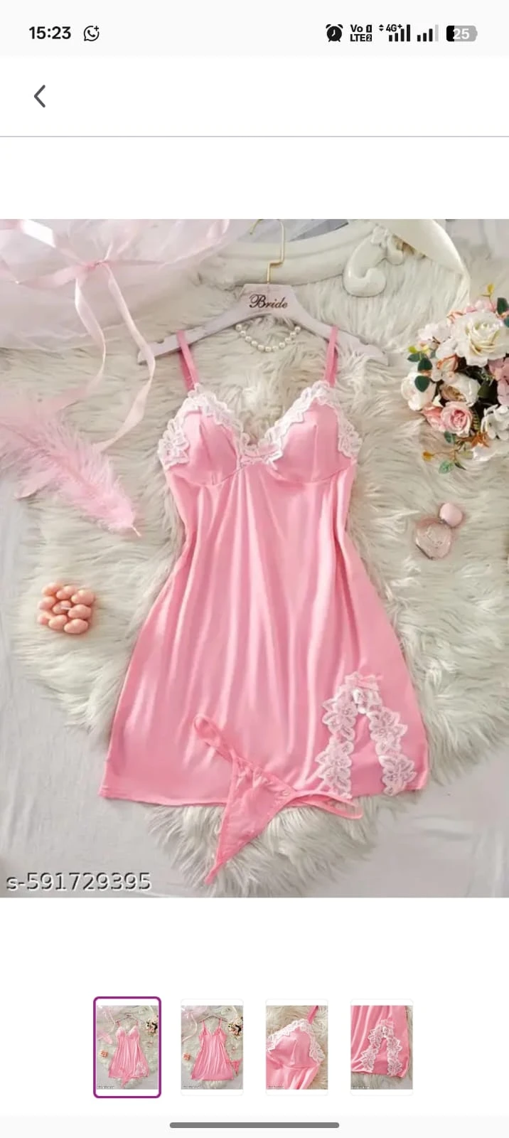 Description: Upgrade your nightwear collection with this elegant pink satin babydoll nighty set, designed for comfort and style. Crafted from smooth and lightweight satin fabric, this piece feels soft on the skin and offers a luxurious look. The delicate white lace detailing on the neckline and hem adds a feminine and graceful touch. This sleeveless design with adjustable straps ensures a perfect fit, while the flowy silhouette provides ease of movement. Ideal for nightwear, honeymoon, or special occasions, this set also includes a matching bottom for a complete look. |
