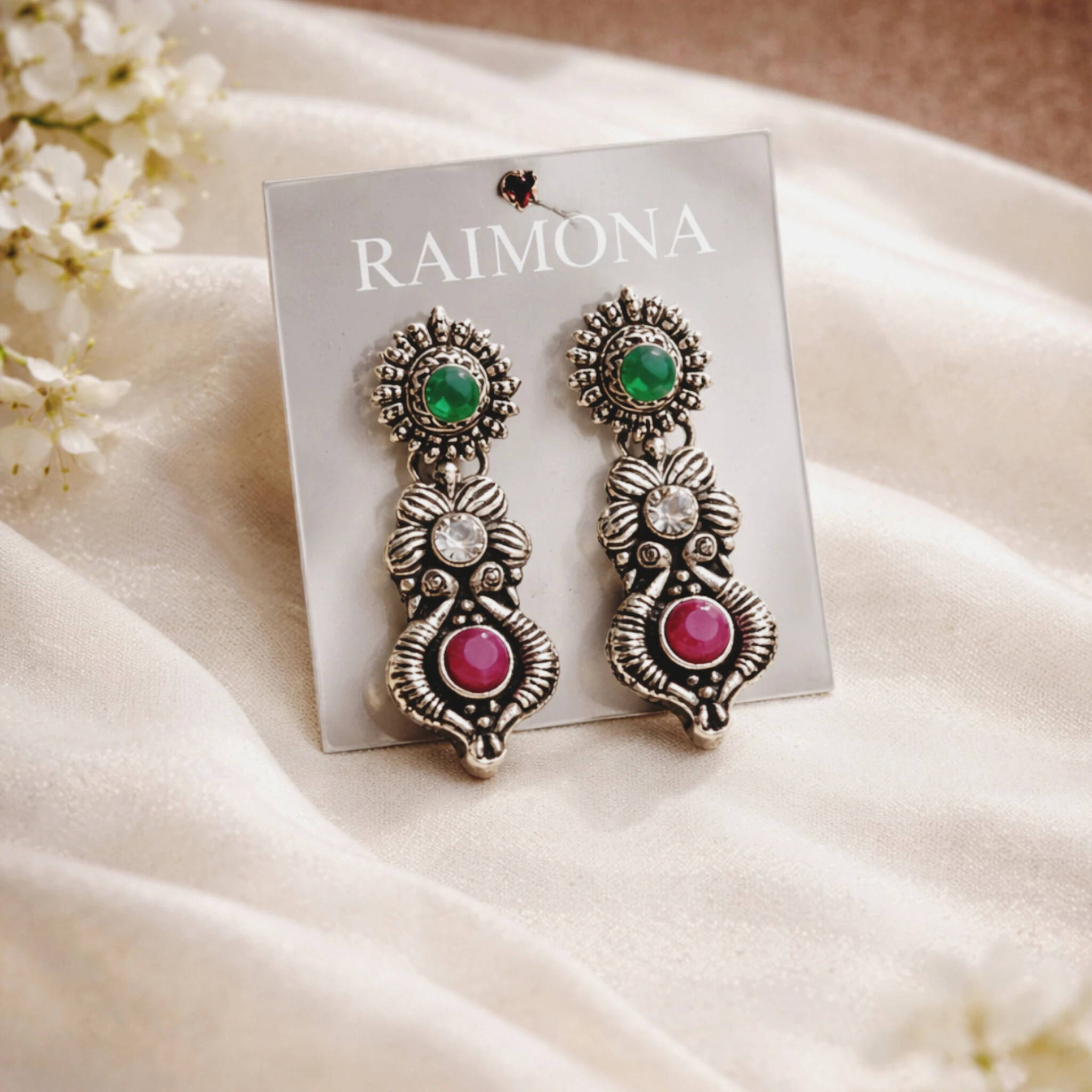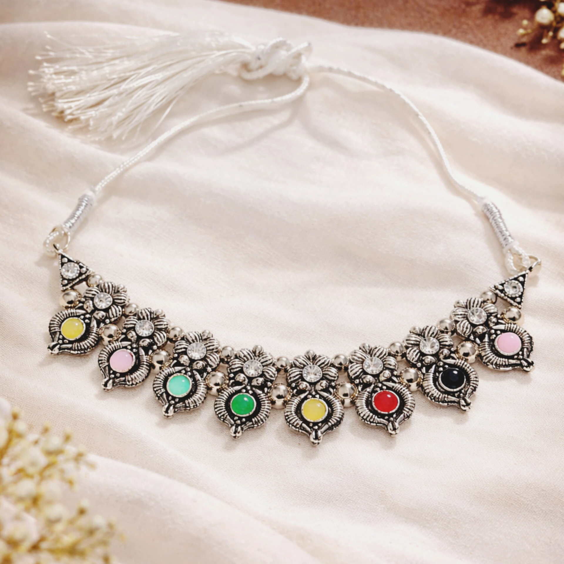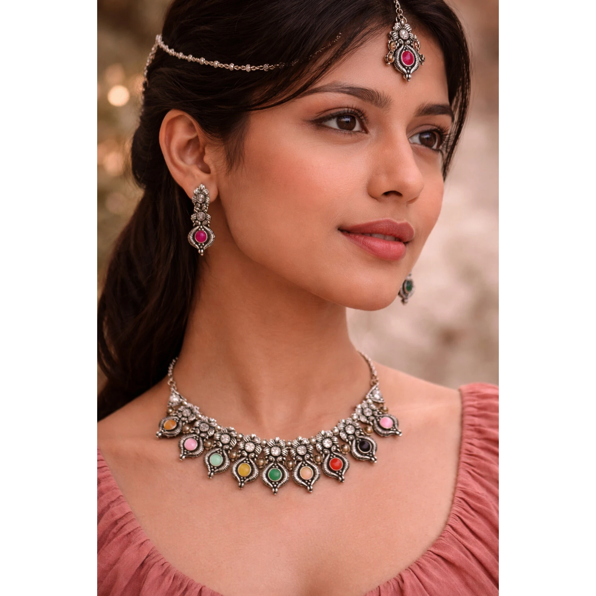 Upgrade your ethnic look with this beautifully crafted oxidised silver jewellery set. Designed with intricate floral patterns and vibrant multicolor stones, this set adds a perfect blend of traditional and trendy style. Ideal for festive wear, weddings, parties, and daily styling. This lightweight and comfortable necklace set comes with matching earrings and a stylish maang tikka, making it a complete accessory for any occasion. Pair it with sarees, kurtis, or lehengas for a stunning look. 💎 Key Features Premium oxidised silver finish Attractive multicolor stone design Lightweight & skin-friendly Perfect for festive & daily wear Complete set: Necklace + Earrings + Maang Tikka Durable and long-lasting polish 📦 Package Includes 1 Necklace 1 Pair of Earrings 1 Maang Tikka 🎯 Target Use Perfect for: Weddings & functions Festivals like Diwali, Navratri Party wear Gifting purpose |