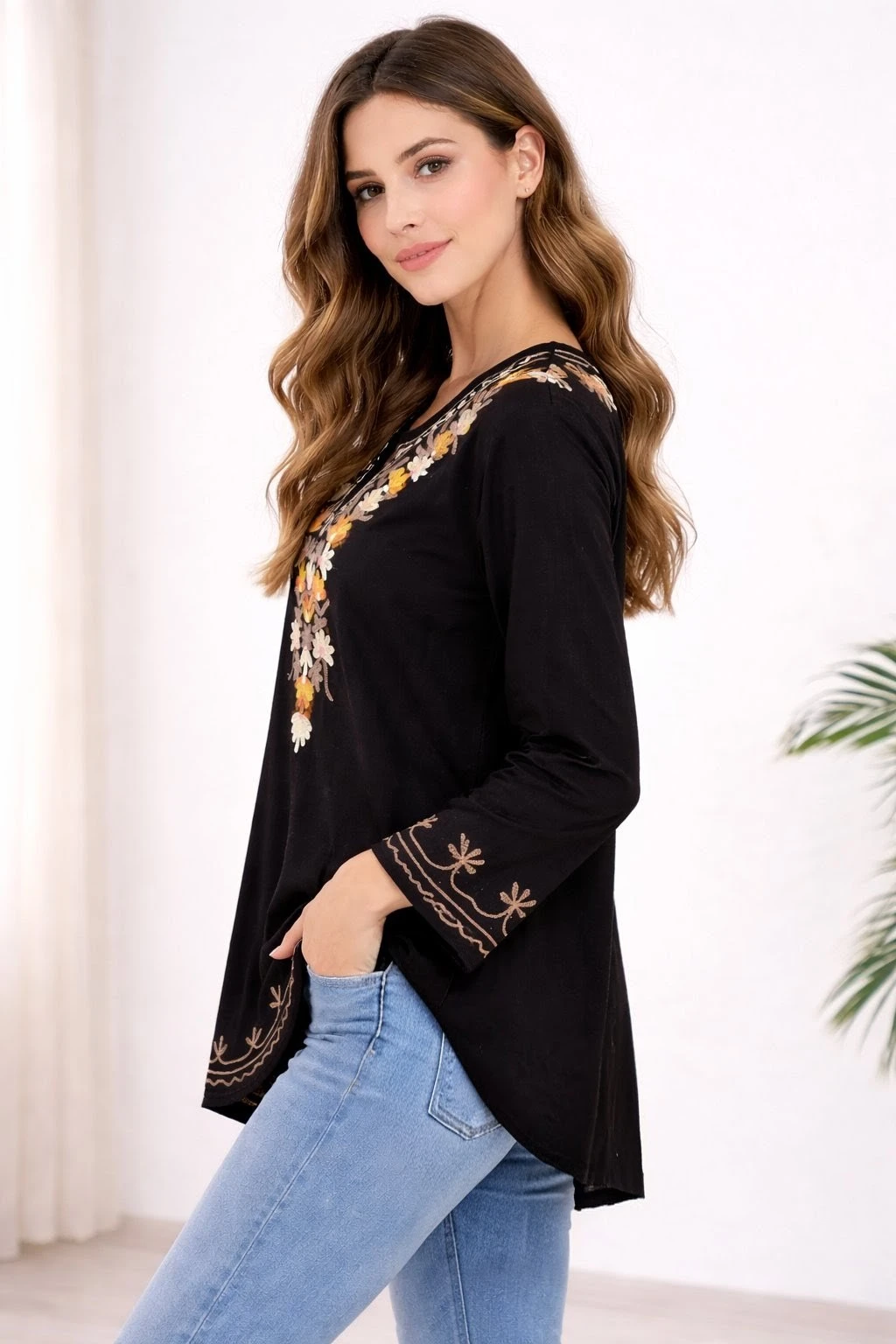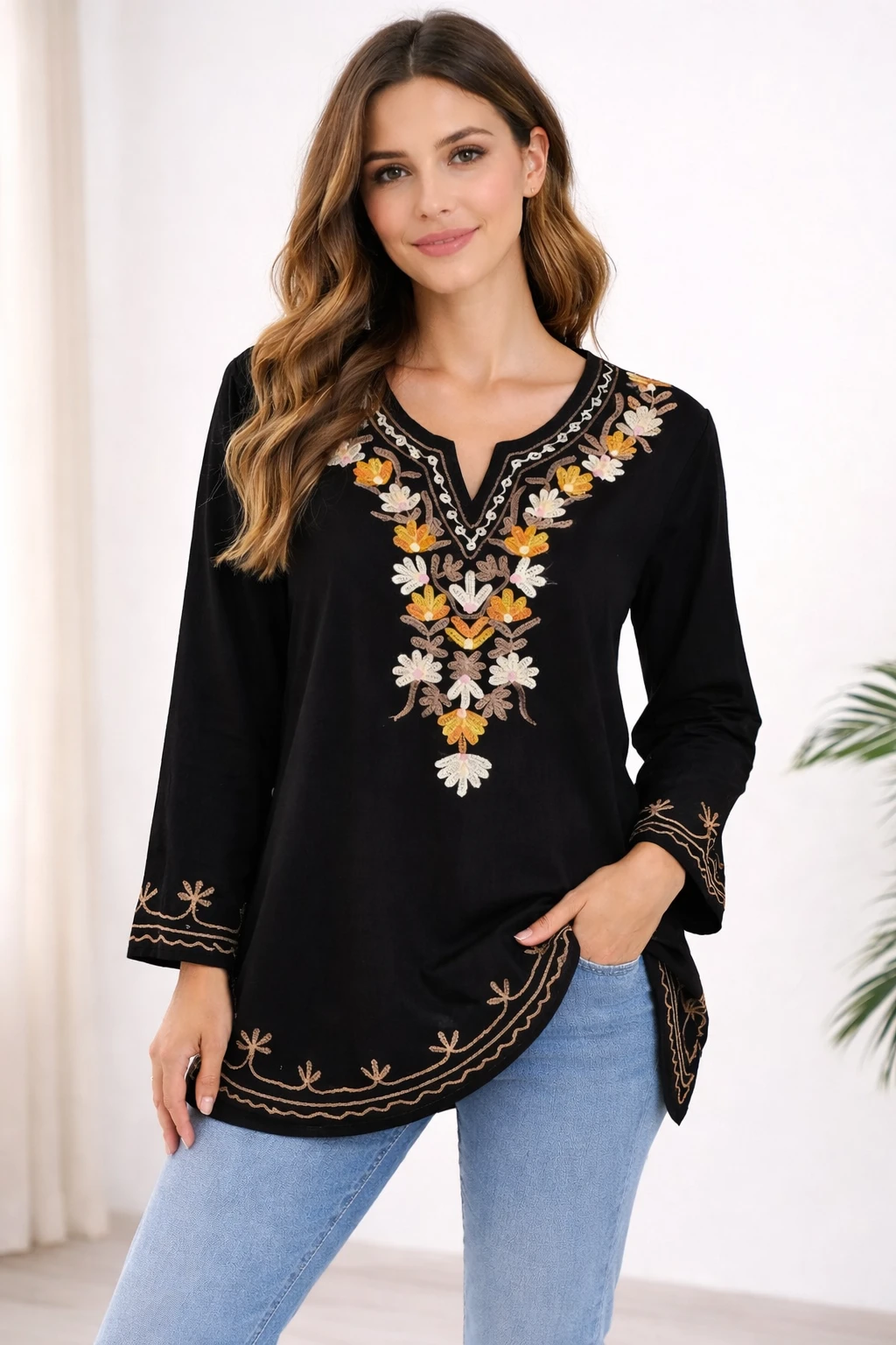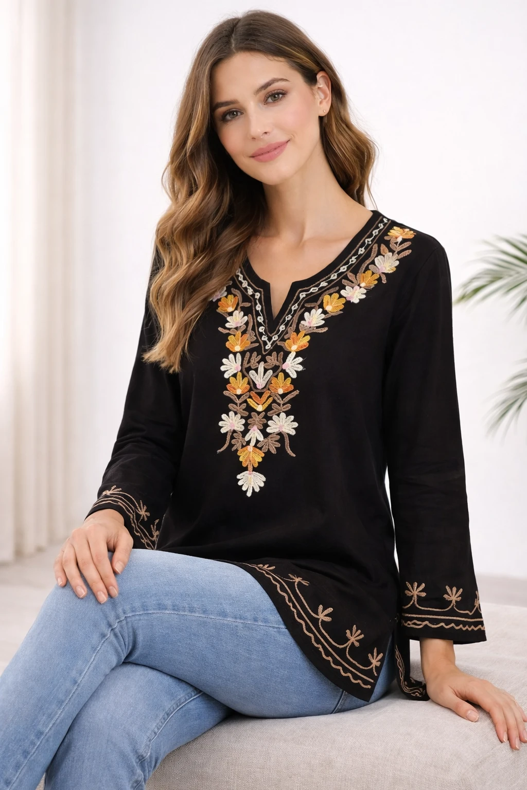 Upgrade your everyday ethnic style with this elegant black embroidered kurti top designed for comfort and sophistication. Crafted from soft and breathable fabric, this kurti features beautiful multicolor floral embroidery on the neckline, adding a vibrant and stylish touch to your look. The flattering V-neck design and 3/4 sleeves provide a perfect blend of traditional and modern appeal, making it suitable for both casual outings and small festive occasions. The minimal embroidery on sleeves and hem enhances the overall elegance without overpowering the design. Pair it with jeans, leggings, or palazzos to create a versatile and effortlessly chic outfit. |